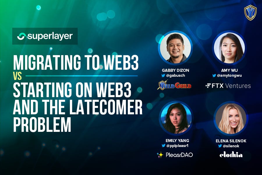 This episode was hosted by Elena Silenok, the founder and CEO of Clothia.com. She was joined by speakers Gabby Dizon, co-founder of Yield Guild Games (YGG), Alex Paley, co-founder of Faraway and Mini Royale: Nation, Emily Yang, co-founder of PleasrDAO, and Amy Wu, Head of Ventures and Gaming at FTX. They were also joined by Mahesh Vellanki, Managing Partner of SuperLayer, and Alex Yao, Community Lead for SuperLayer.